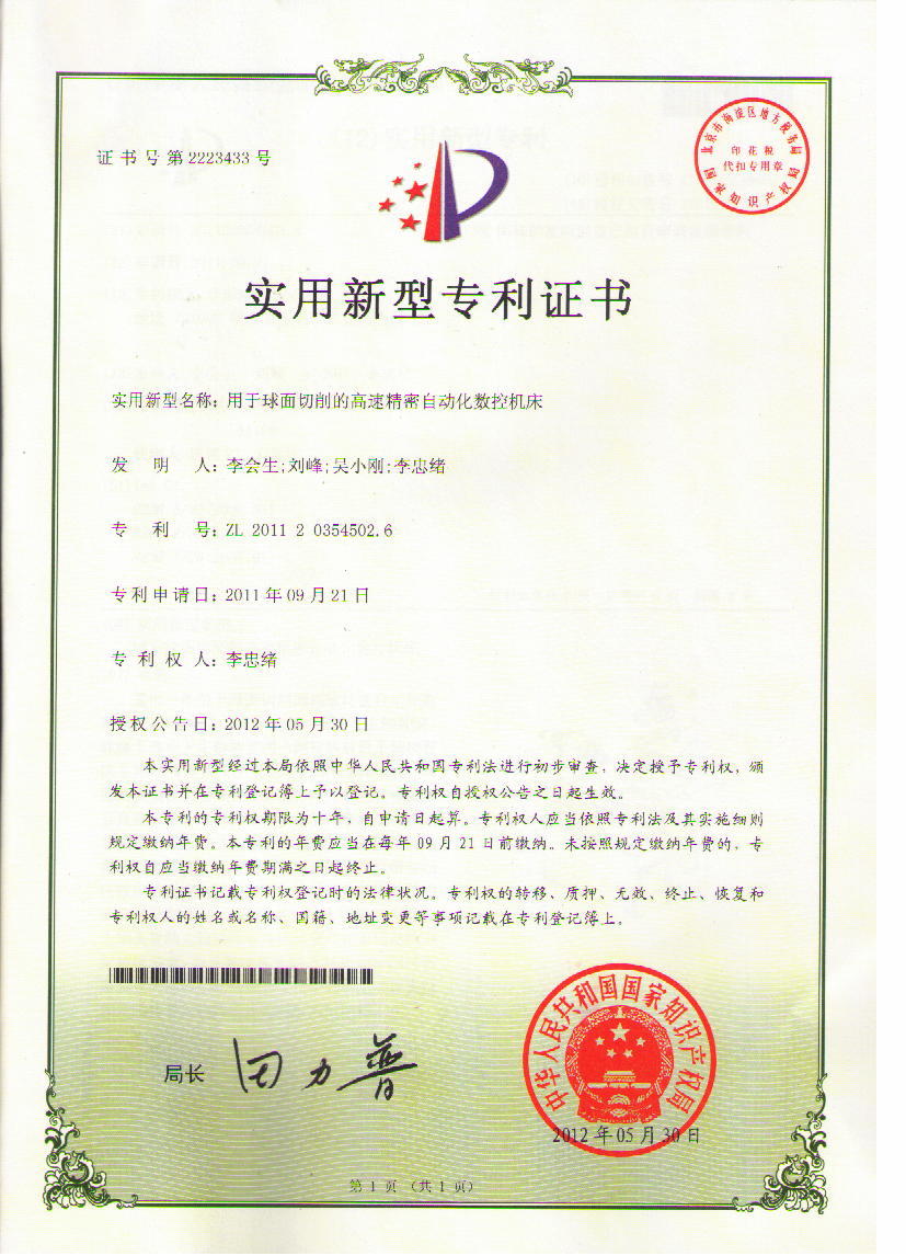| 用于球面切削的高速精密自動化數控車床通過授權 |
